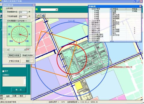 1 影响范围分析:以当前事故点为中心,根据功能窗口上的“紧急隔离半径”和“下风向防备距离”在地图上生成影响范围效果图,红圈表示紧急隔离范围,蓝圈表示防备距离,根据风向的设置,以黄框表示的防备区也将不断进行变化。可通过功能窗口上的信息显示按钮,分别查询三个区域中所有的被影响单位的信息。