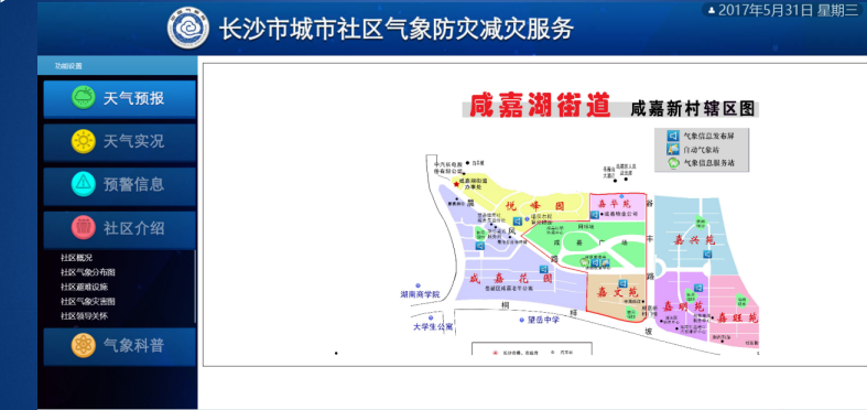 长沙社区气象触摸屏是中国气象走进社区,为社区提供专业气象服务的标杆试点工程,得到长沙市委市政府、市人大领导的参观认可,系统平台包括都市天气、气象产品、社区服务三大版块,提供气象预报、雷达图、云图、环境气象、指数气象、交通气象等社区气象服务产品。触摸屏端主要实现气象预警、天气实况、天气预报、服务产品、气象指南及社区服务等信息内容的查询展示功能。